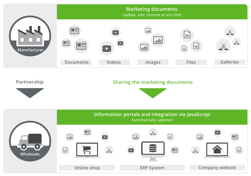 As a wholesaler, you can fill your portals with documents provided by manufacturers. The mandatory requirement for the data transfer of documents, videos and item-related data are partnerships.