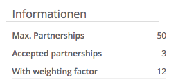 You can view the weighting factor of your partners under "All Partnerships" in the "Partner" menu of the navigation bar. The concrete weighting factor of each individual partner can be seen in the tabular overview.
