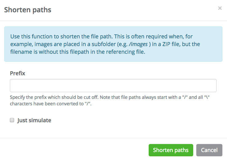 The "Shorten paths" option is used to remove subfolder names in ZIP files from the name of the uploaded files, to match the specific filename in an assignment file.